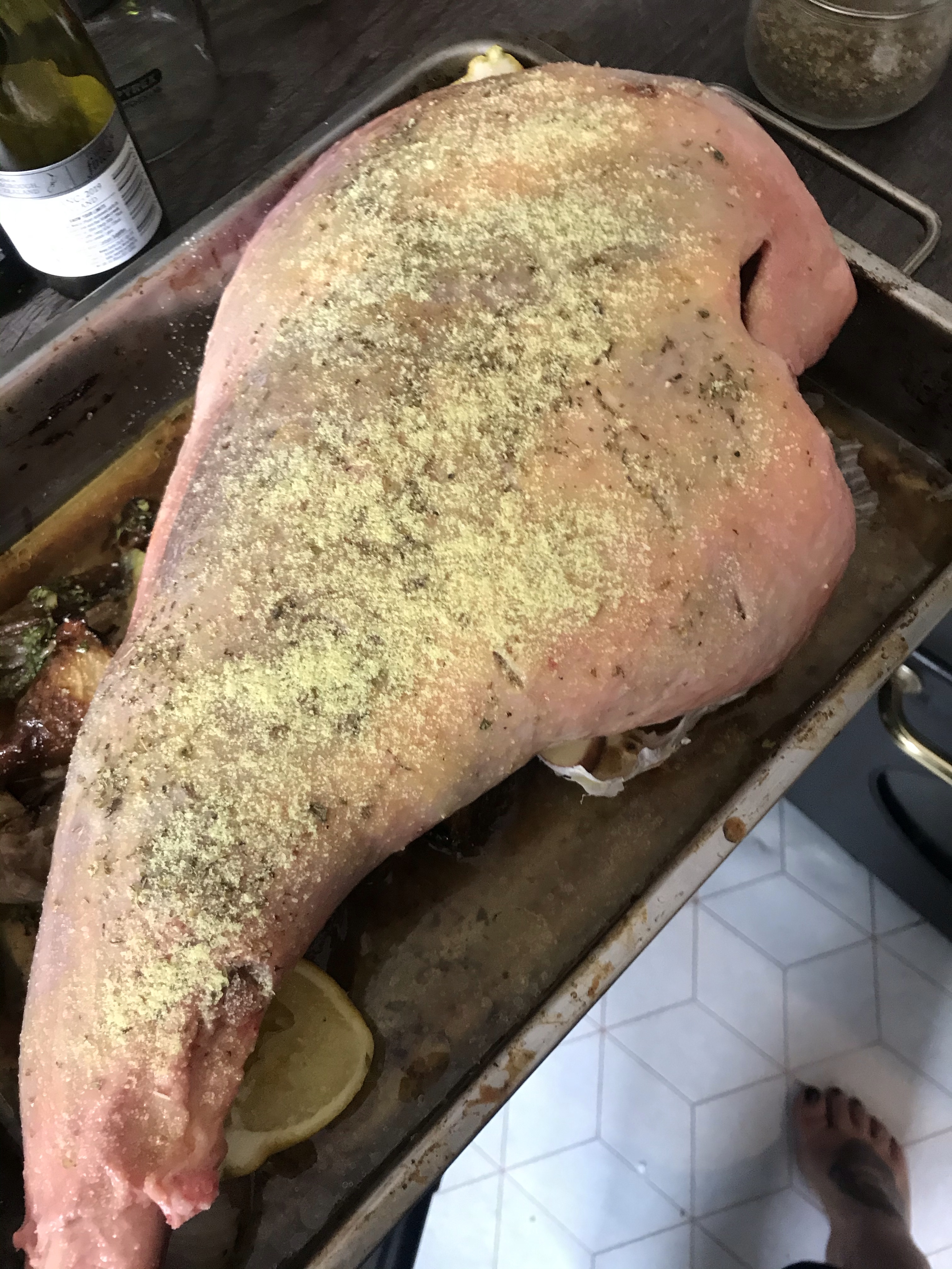 Pour in the white wine and drizzle the lamb with olive oil and sprinkle over mustard powder, oregano salt and pepper.